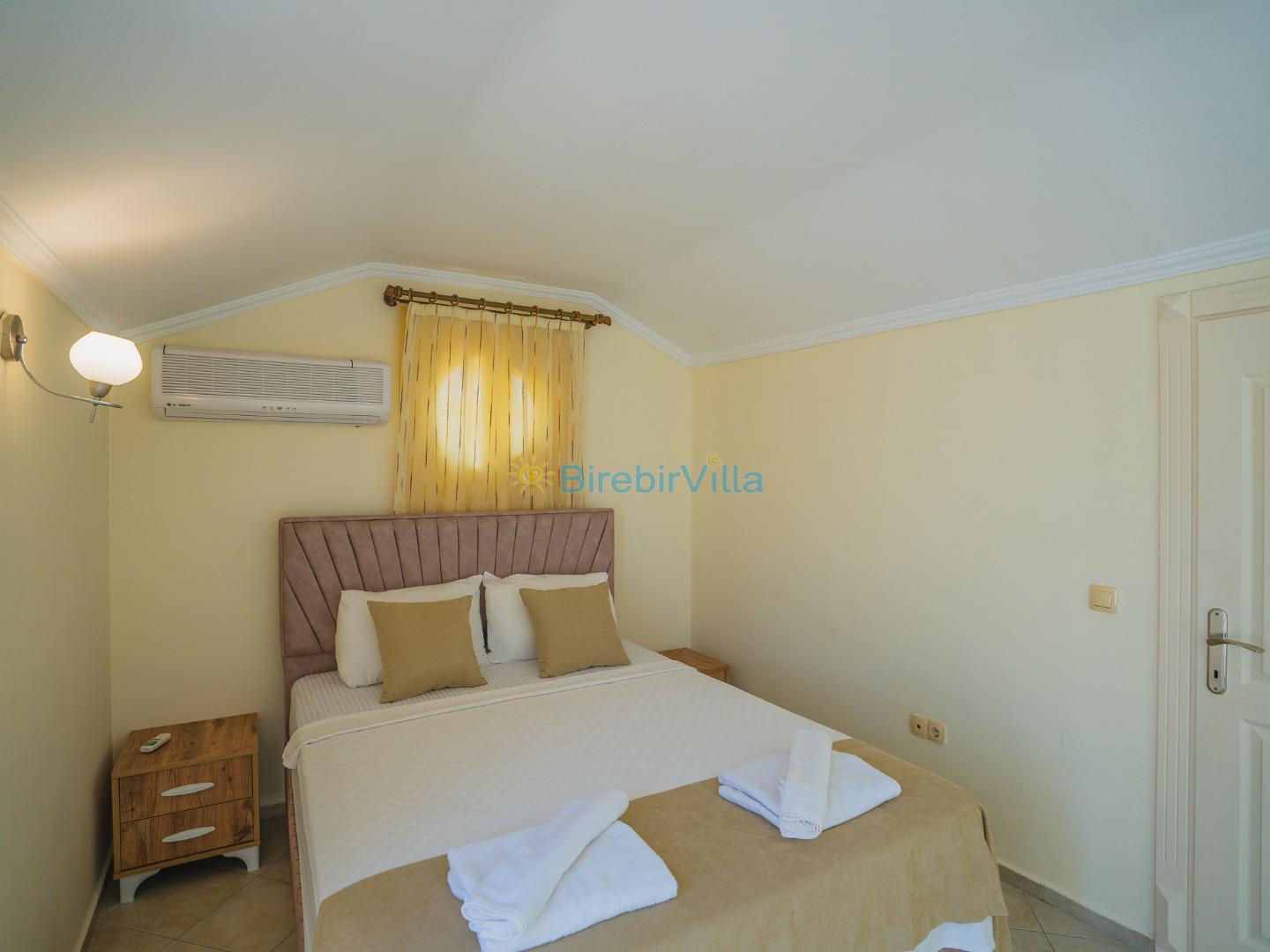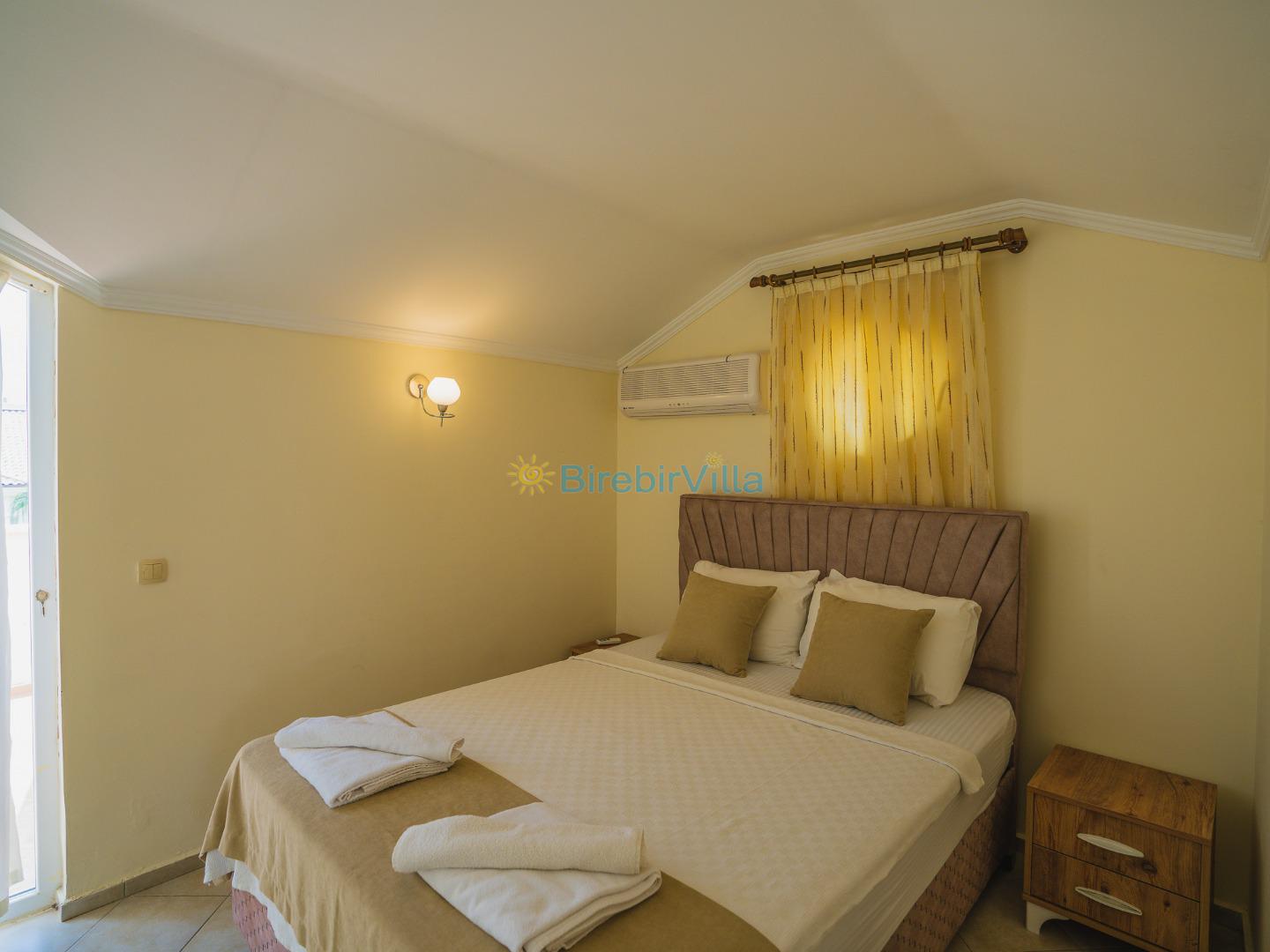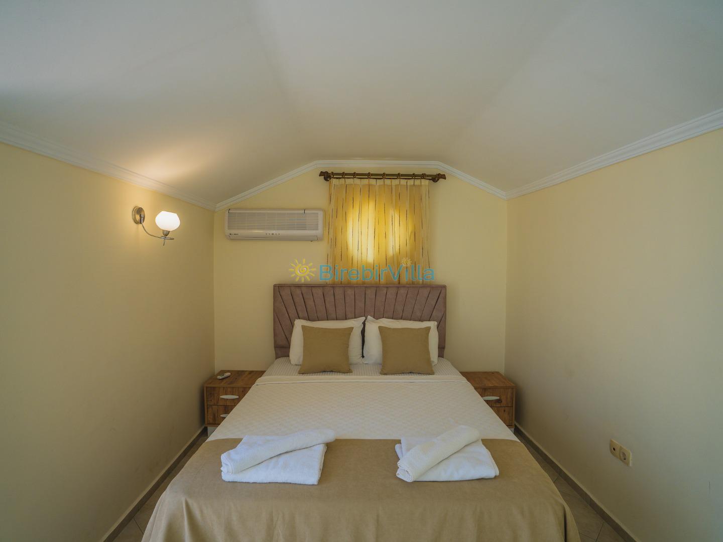 2.Yatak odası: Çift kişilik yatak, klima, elbise dolabı, komodin ve ebeveyn banyo bulunmaktadır.