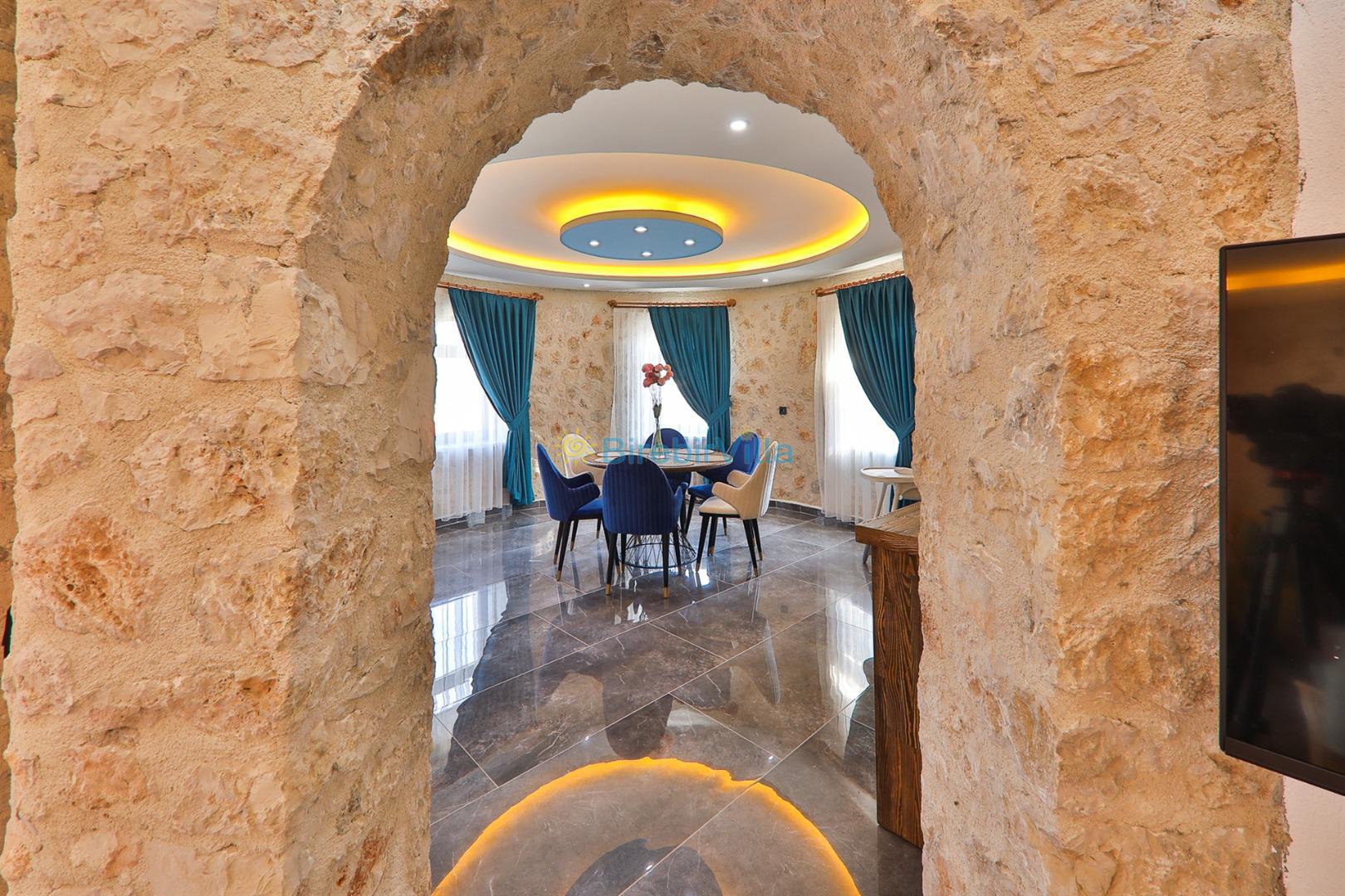 Salon: Özenle döşenmiş açık mutfaklı salon, klima, modern koltuklar, 6 kişilik yemek masası, Led tv, uydu alıcısı ve havuza açılan kapısı bulunmaktadır.