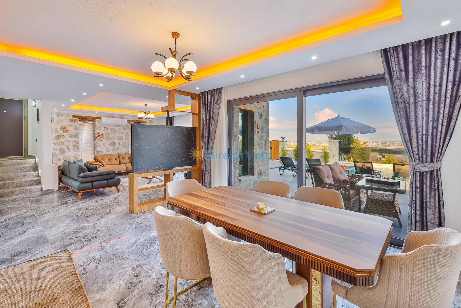 Salon: Özenle döşenmiş açık mutfaklı salon, klima, modern koltuklar, 6 kişilik yemek masası, Led tv, uydu alıcısı ve havuza açılan kapısı bulunmaktadır.