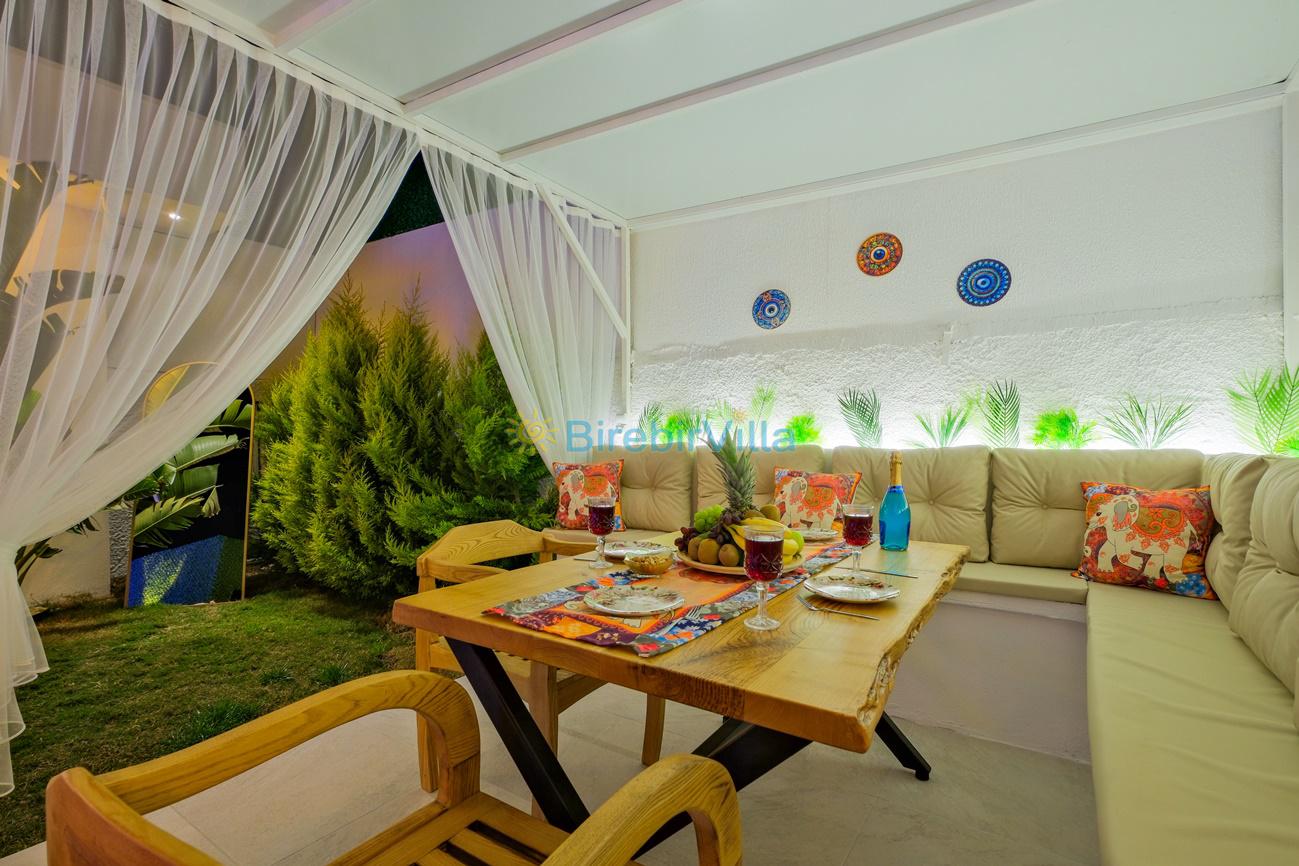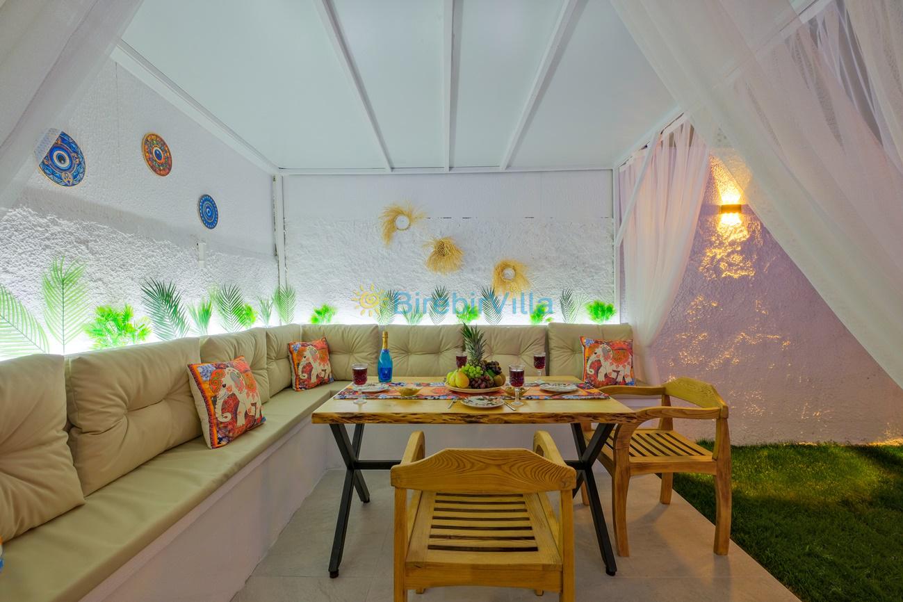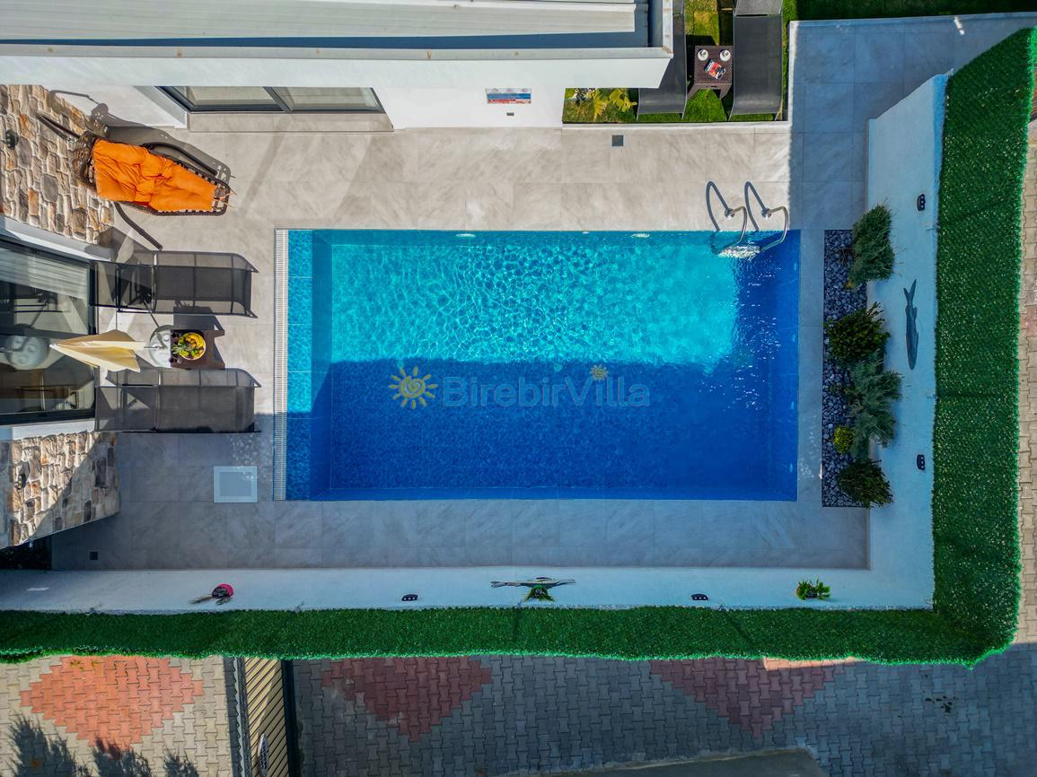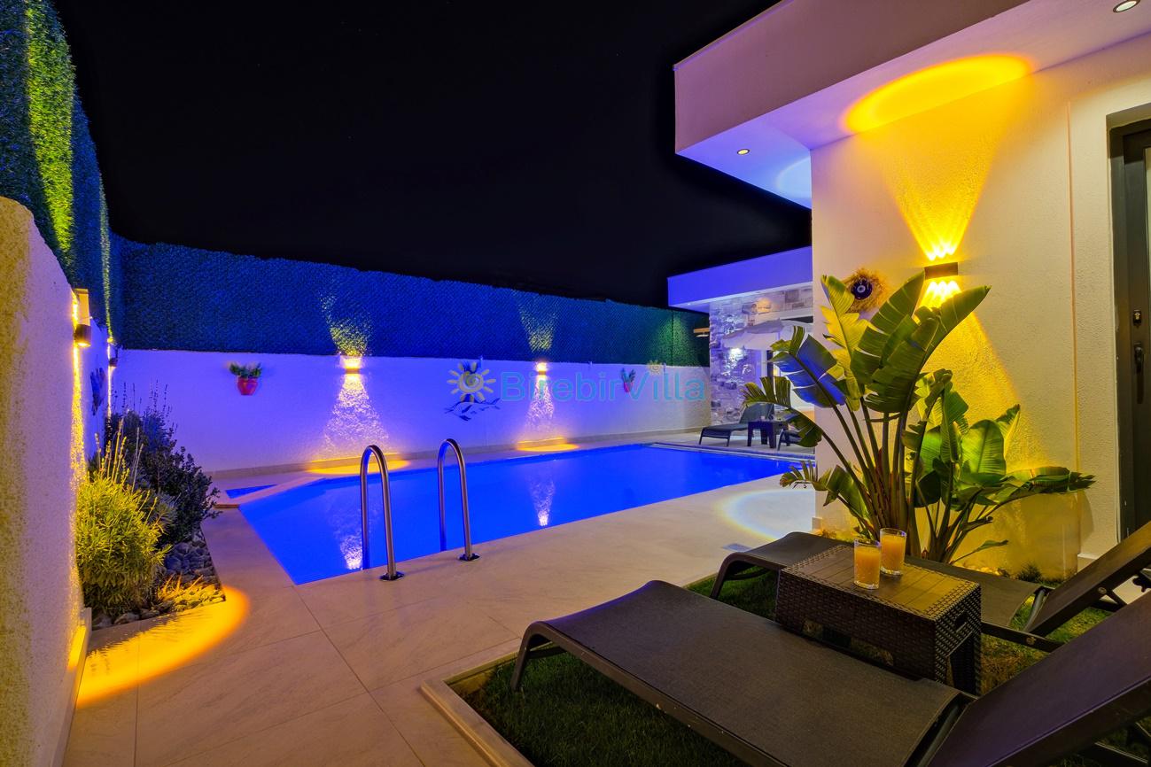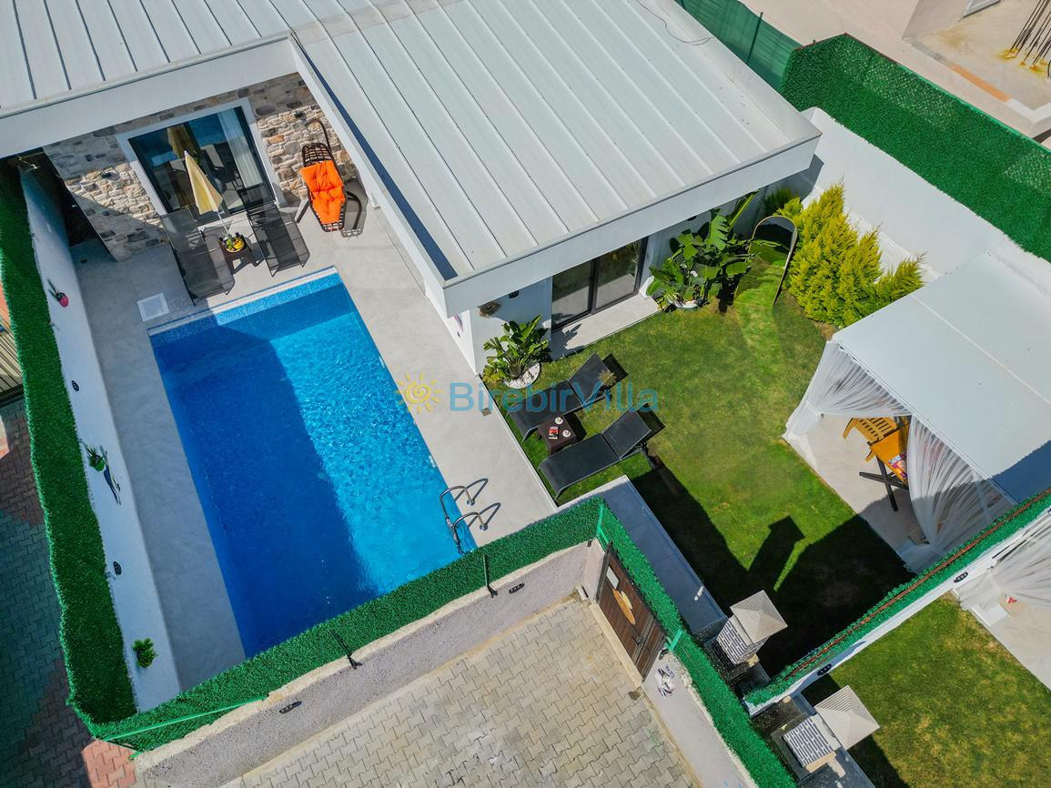 Not : Doğa ile iç içe konuma sahip olan tüm villalarımızda düzenli olarak ilaçlama yapılır. Buna rağmen çevrede haşere vb. bulunma ihtimali vardır. Havuzu korunaklı villalarımızda kesinlikle %100 görünmememe garantisi vermemekteyiz. Bu villalarımızda her zaman %10 sakınma payı mevcuttur. Sitemizde bulunan villa fotoğraflarının, görüntüyü ekrana sığdırmak için ’Geniş Açılı Lens’ ile çekilmektedir. Bu sebeple resimlerdeki objeler, gerçek boyutlarından daha büyük veya küçük görünebilmekte.
