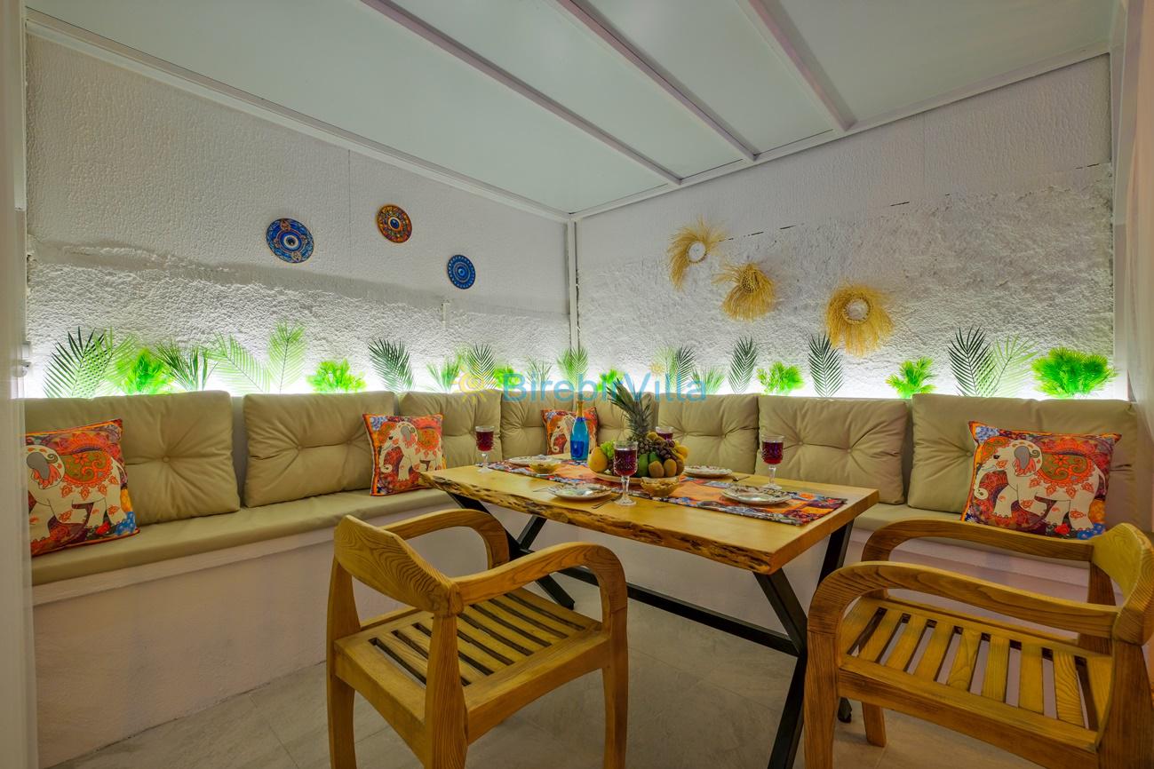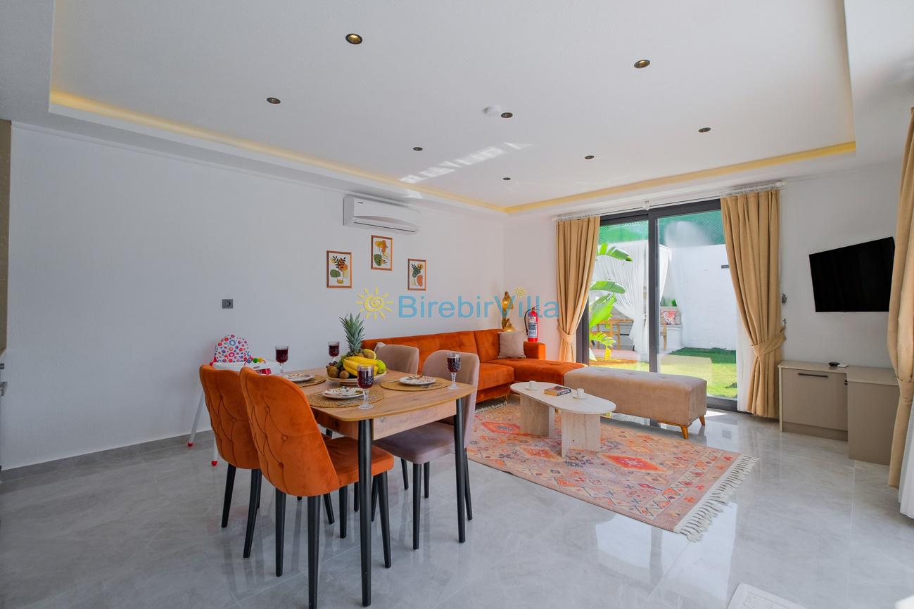 Salon: Özenle döşenmiş açık mutfaklı salon, modern koltuklar, 4 kişilik yemek masası, mama sandalyesi, Lcd tv, uydu alıcısı ve klima bulunmaktadır. Salondan havuz ve bahçeye açılan kapısı mevcuttur.