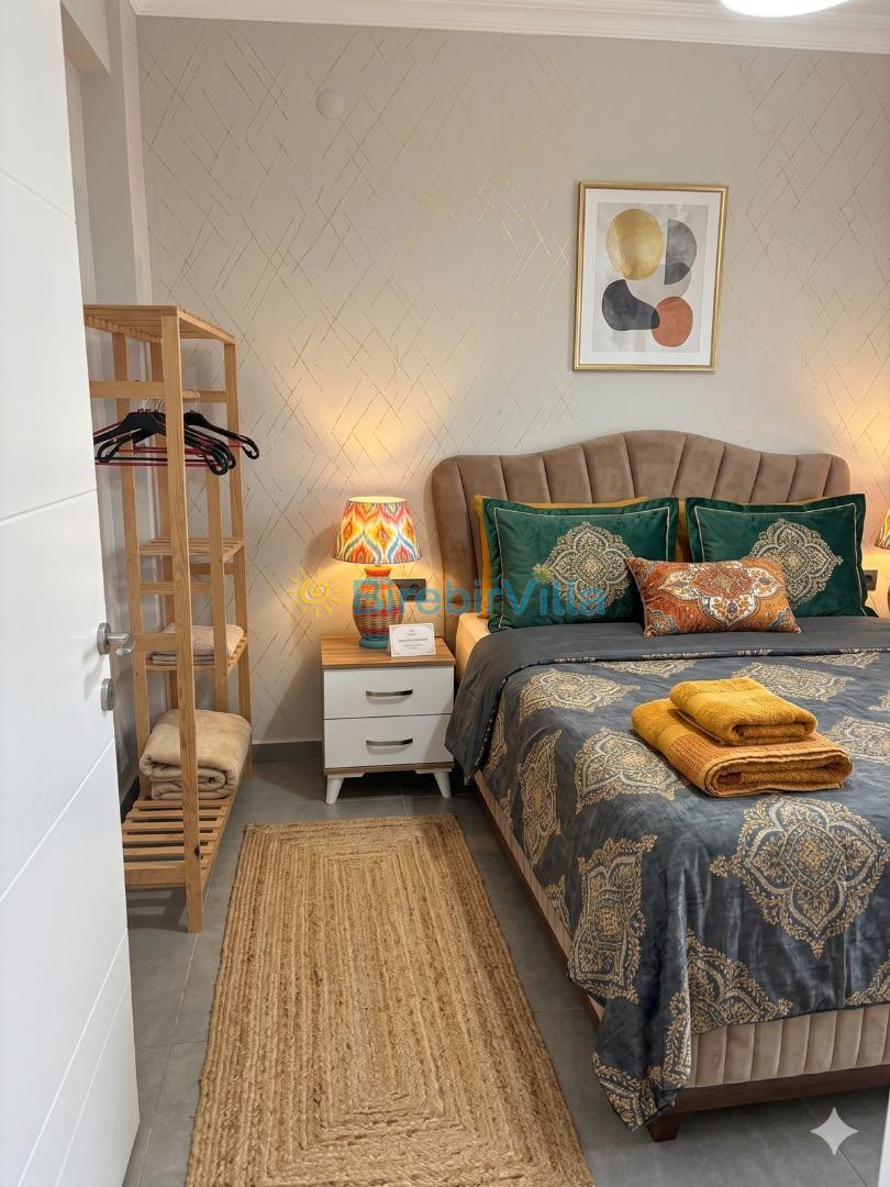 1.Yatak odası: Çift kişilik yatak, klima, ebeveyn banyo ve elbise dolabı bulunmaktadır.
