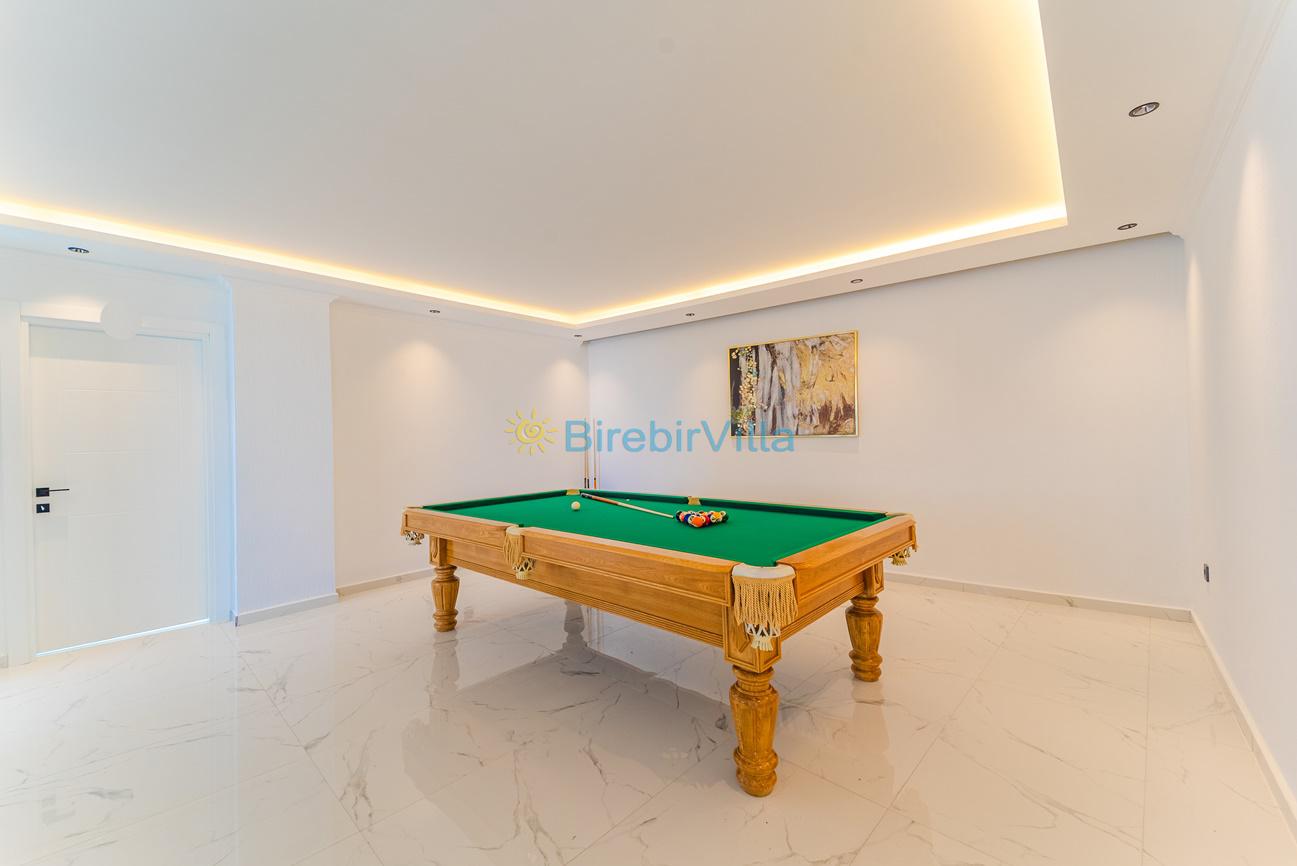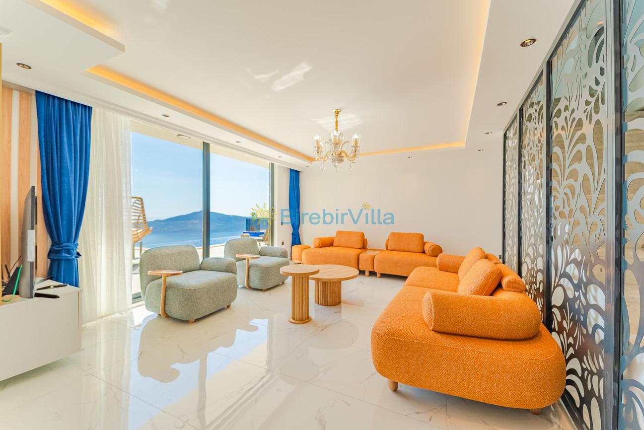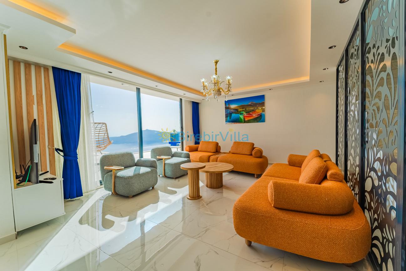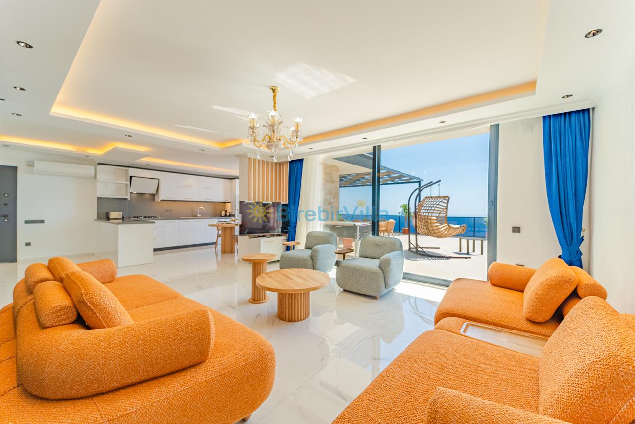 Salon: Özenle döşenmiş açık planlı mutfak, modern oturma grubu, Lcd tv, uydu alıcısı ve klima bulunmaktadır. Havuz-bahçe alanına çıkış kapısı bulunmaktadır.