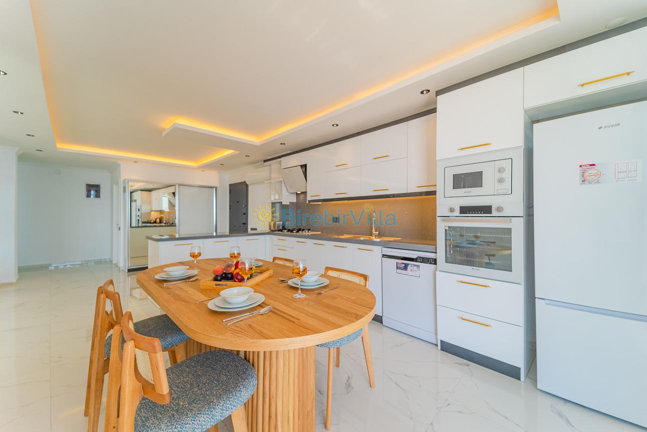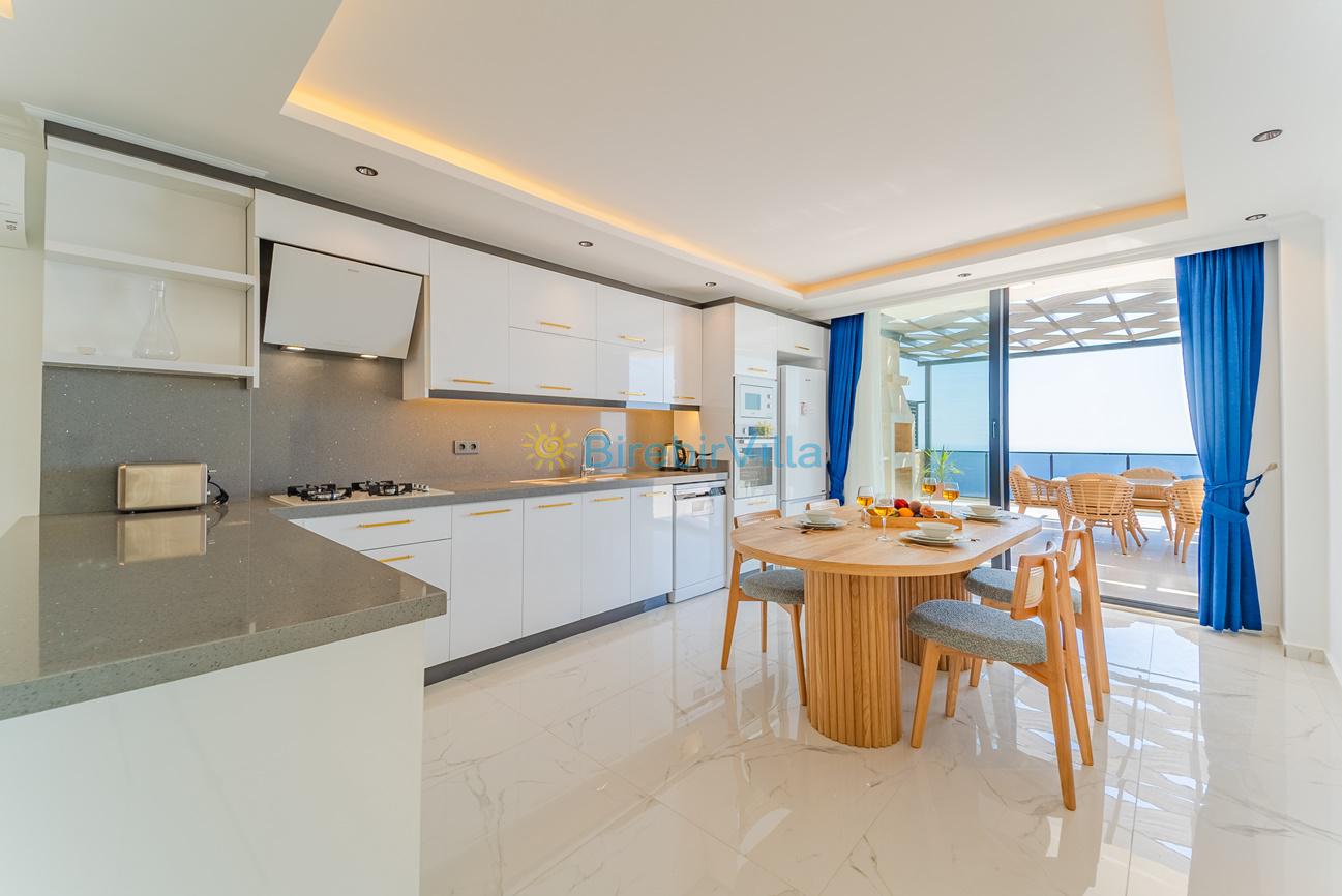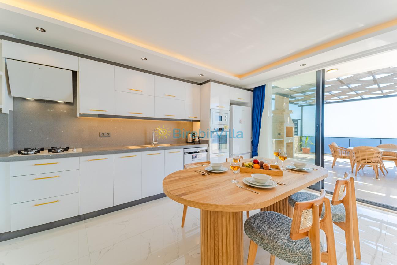 Mutfak: Açık planlı ada mutfak, 4 kişilik yemek masası, 10 kişi ve daha fazla kişiye yetecek kadar mutfak malzemeleri, bulaşık makinesi, fırın, ocak, buzdolabı,mikrodalga fırın,ekmek kızartma makinası, tost makinası, elektrikli çay makinesi, çaydanlık ve kettle bulunmaktadır.