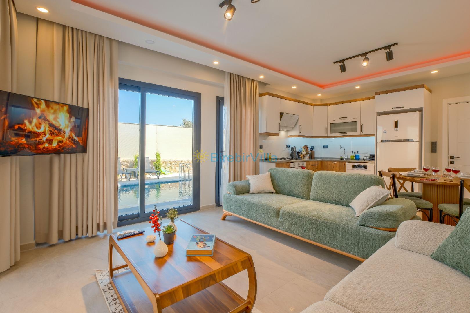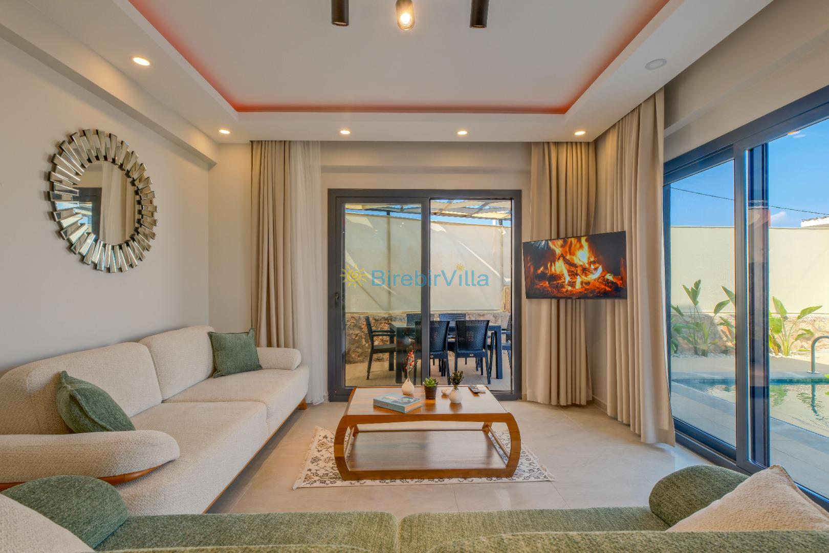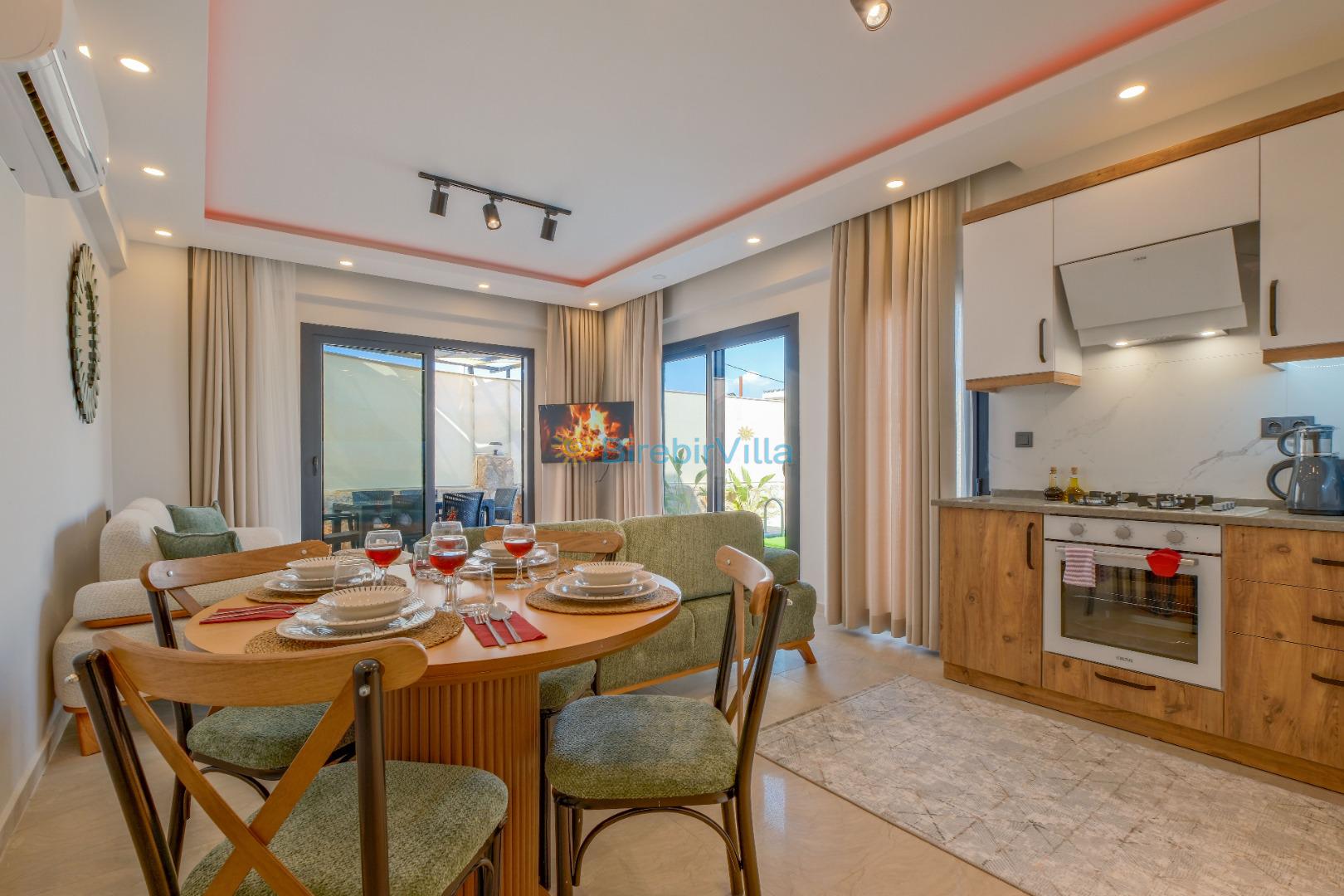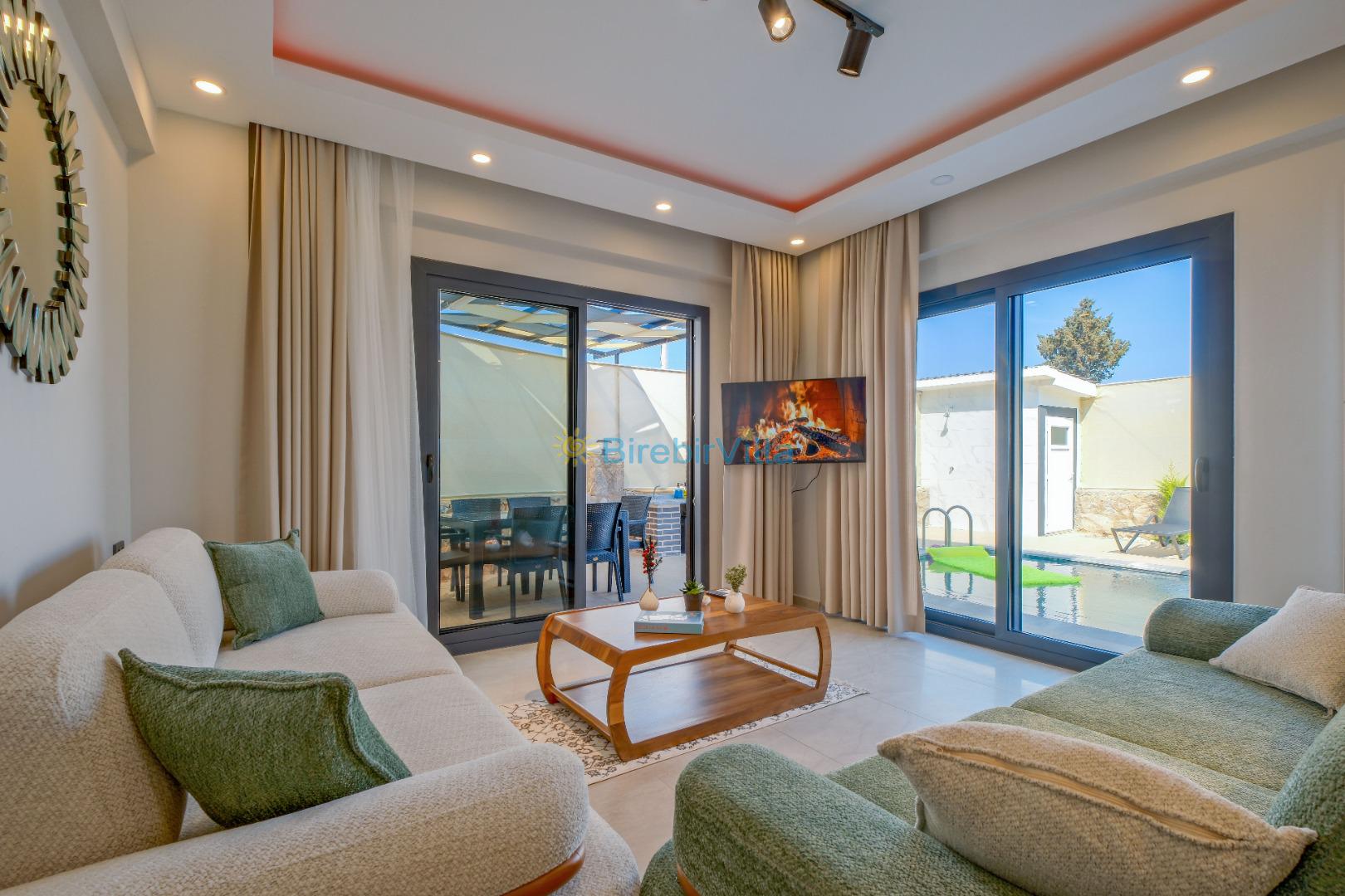 Salon: Özenle döşenmiş açık mutfaklı salon, klima, modern koltuklar, 6 kişilik yemek masası, Led tv, uydu alıcısı, havuz ve bahçeye açılan kapısı bulunmaktadır.
