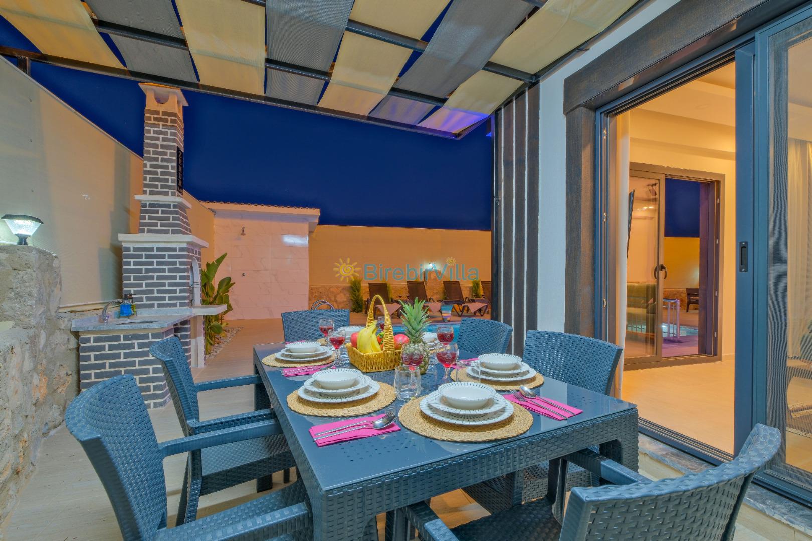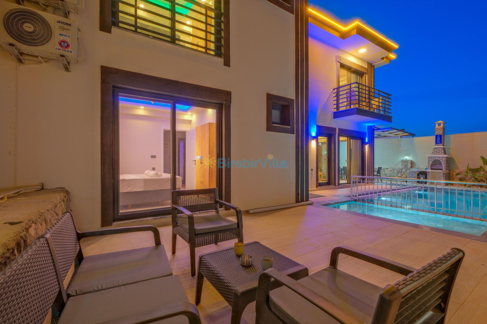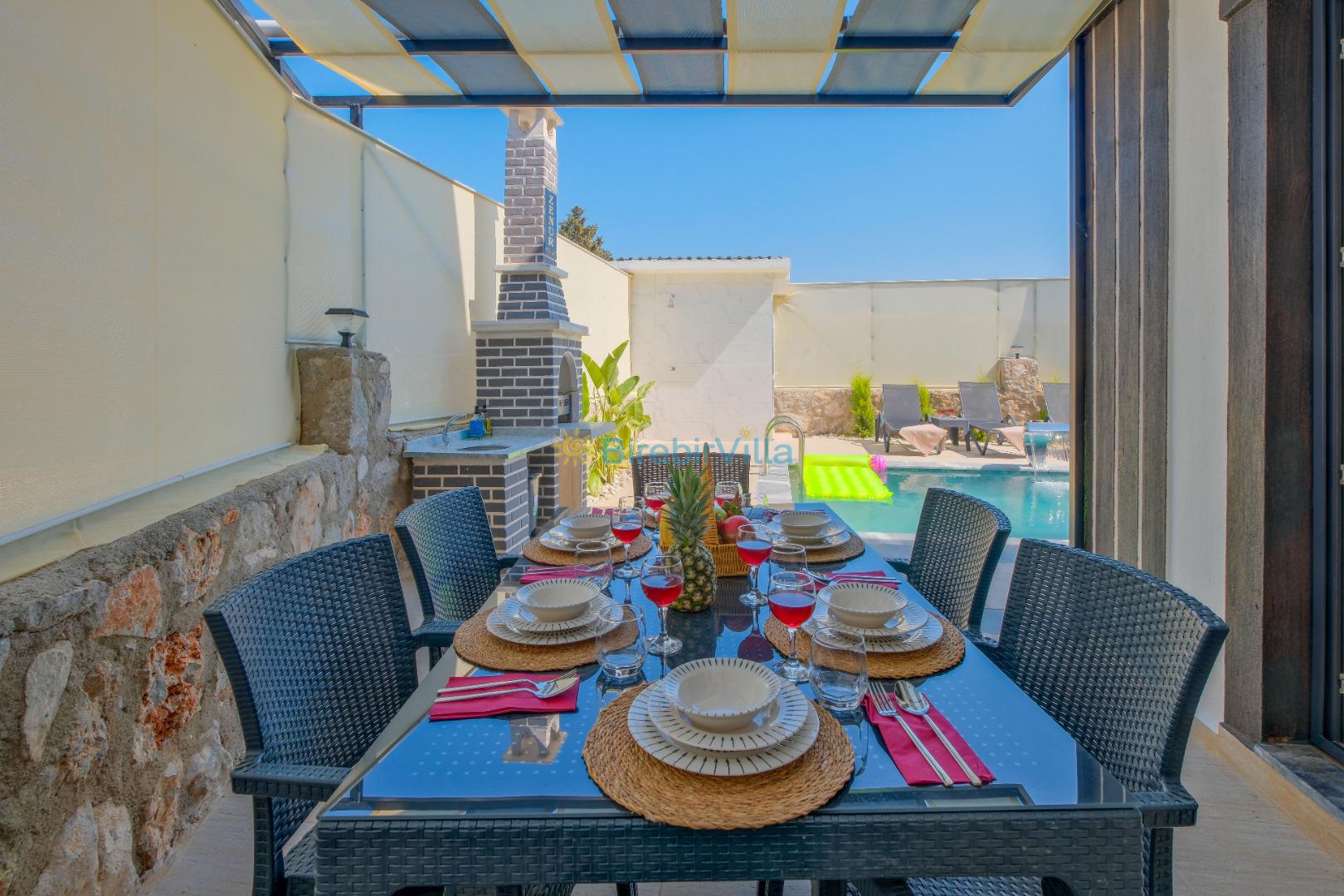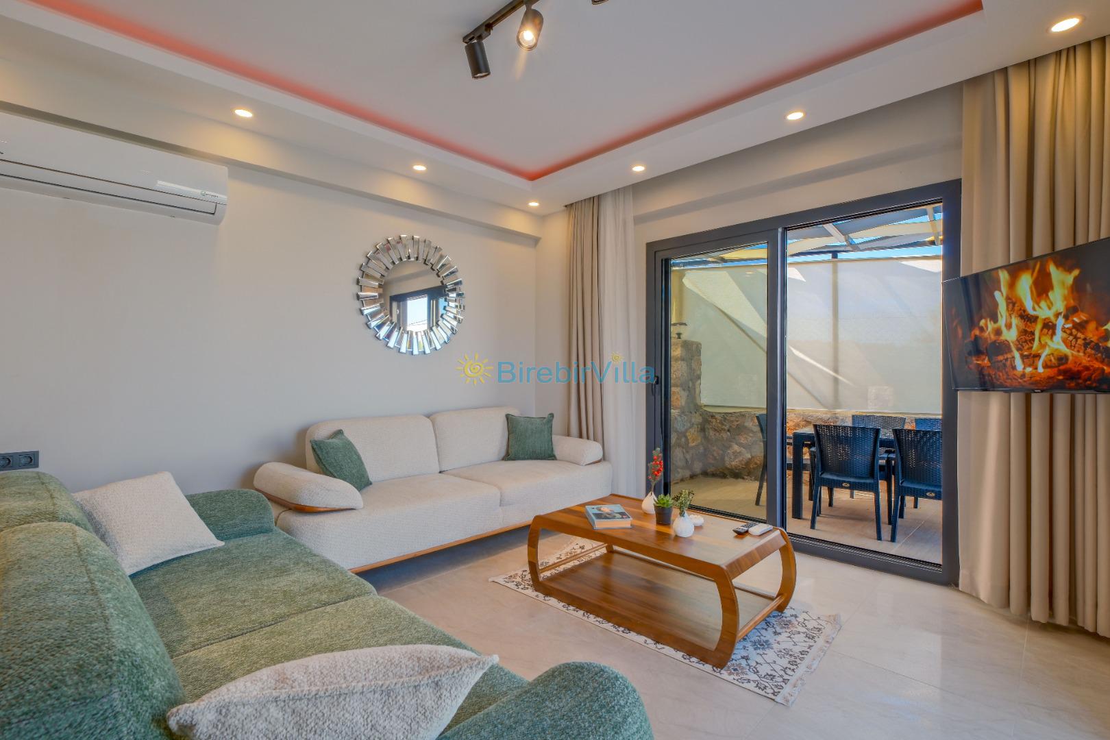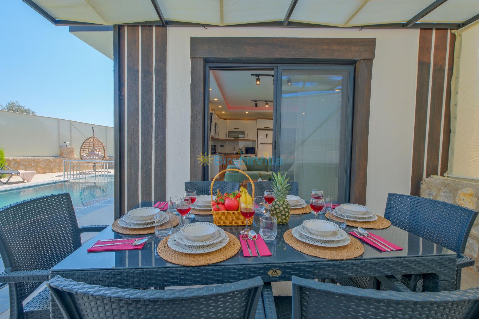 Salon: Özenle döşenmiş açık mutfaklı salon, klima, modern koltuklar, 6 kişilik yemek masası, Led tv, uydu alıcısı, havuz ve bahçeye açılan kapısı bulunmaktadır.