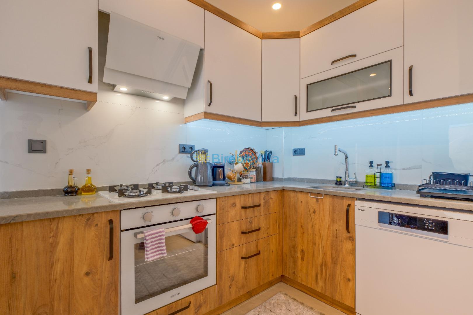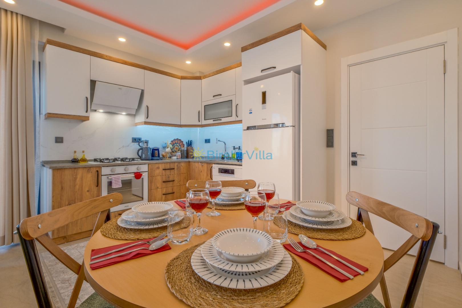 Mutfak: Açık planlı mutfak, 6 kişi ve daha fazla kişiye yetecek kadar mutfak malzemeleri, bulaşık makinesi, çamaşır makinesi, fırın, ocak, buzdolabı, çay makinesi, kahve makinesi, çaydanlık ve kettle bulunmaktadır.