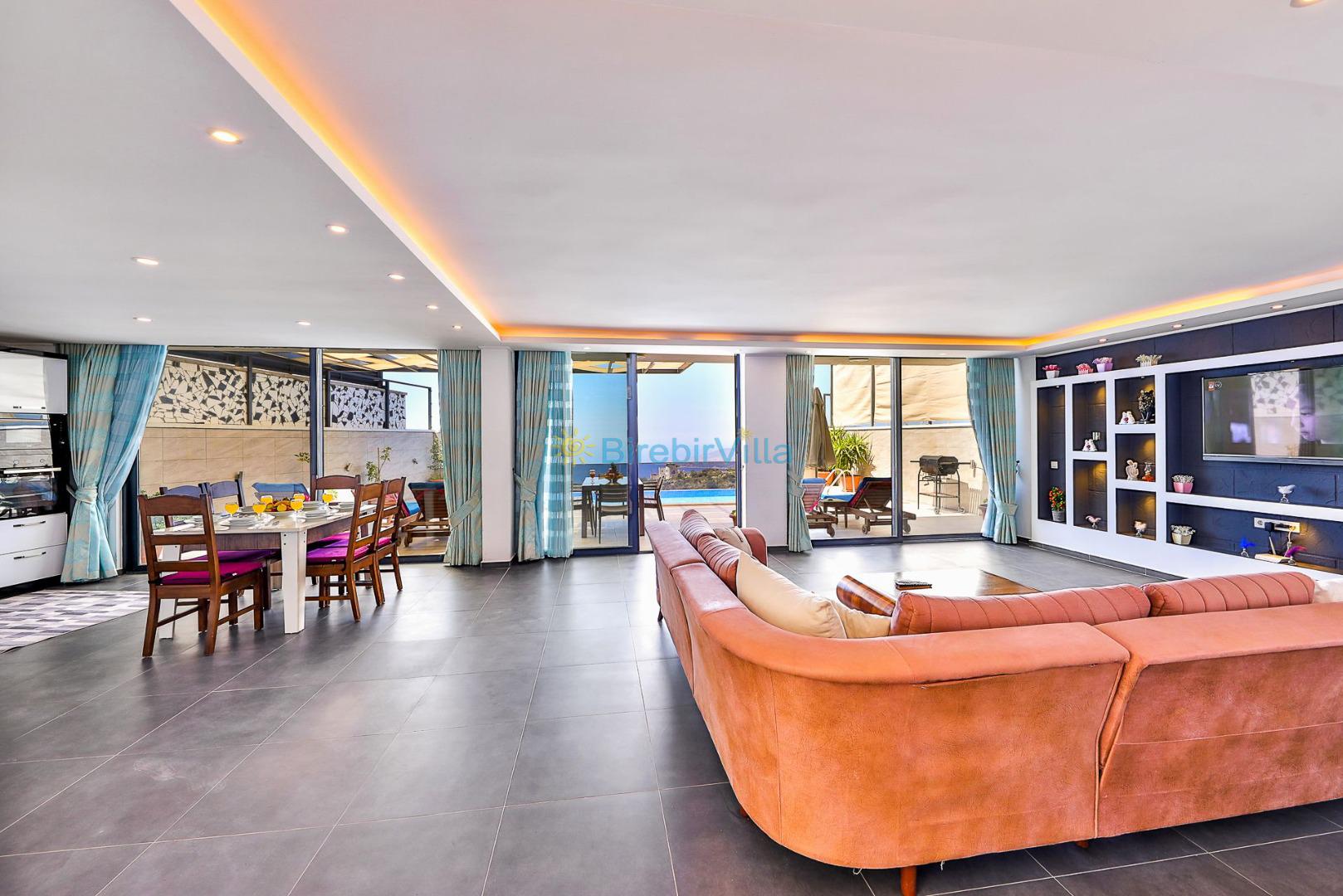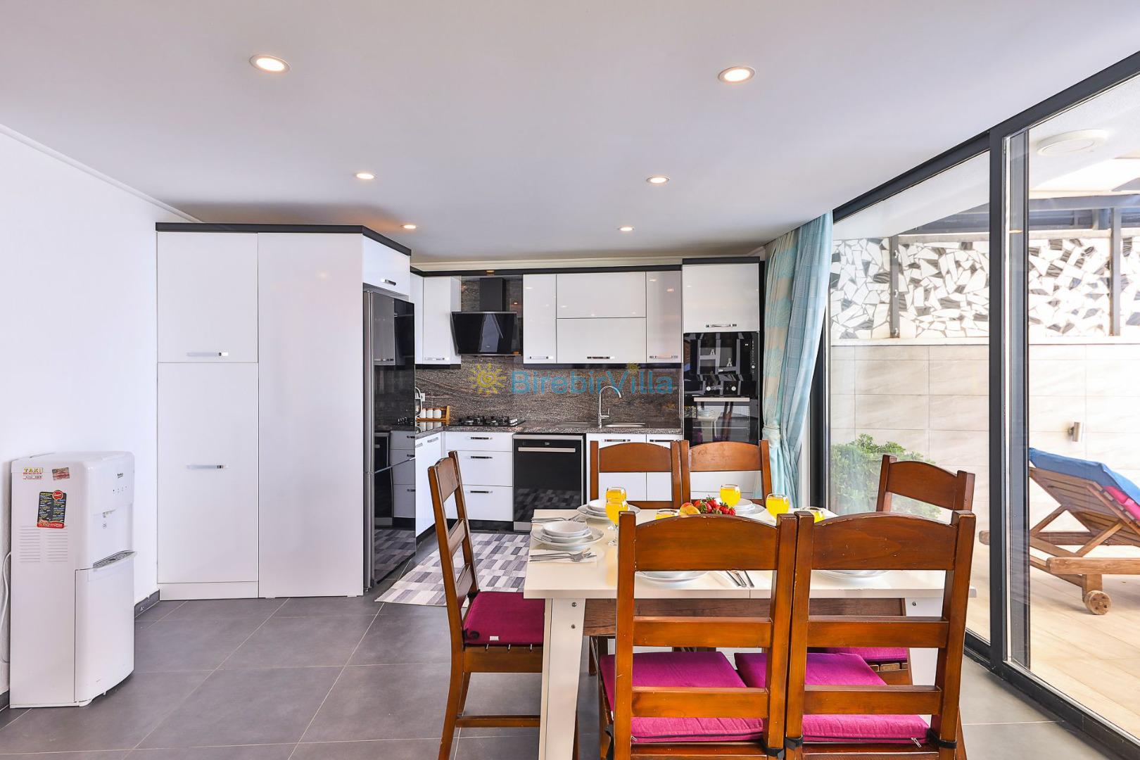 Salon: Özenle döşenmiş açık mutfaklı salon, modern koltuklar, 8 kişilik yemek masası, mama sandalyesi, Lcd tv, uydu alıcısı ve klima bulunmaktadır. Salondan havuz ve bahçeye açılan kapısı mevcuttur.