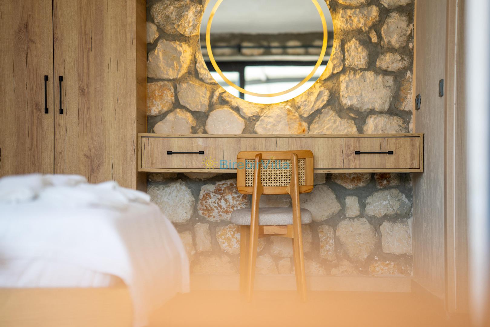1.Yatak odası: Çift kişilik yatak, klima, komodin, makyaj masası, ebeveyn banyo ve elbise dolabı bulunmaktadır.