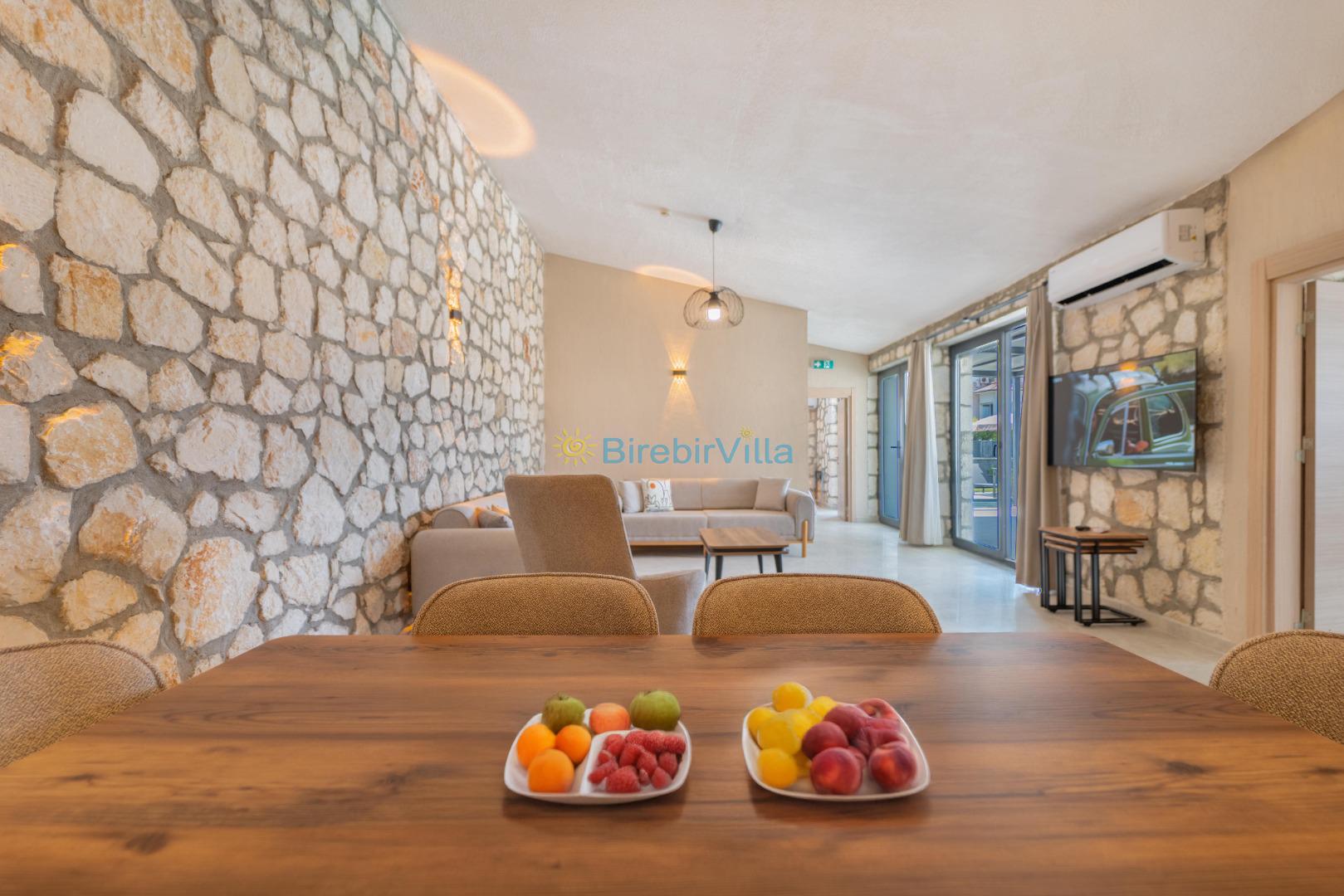Salon: Özenle döşenmiş açık mutfaklı salon, modern koltuklar, 6 kişilik yemek masası, Lcd tv, uydu alıcısı ve klima bulunmaktadır. Salondan havuz ve bahçeye açılan kapısı mevcuttur.